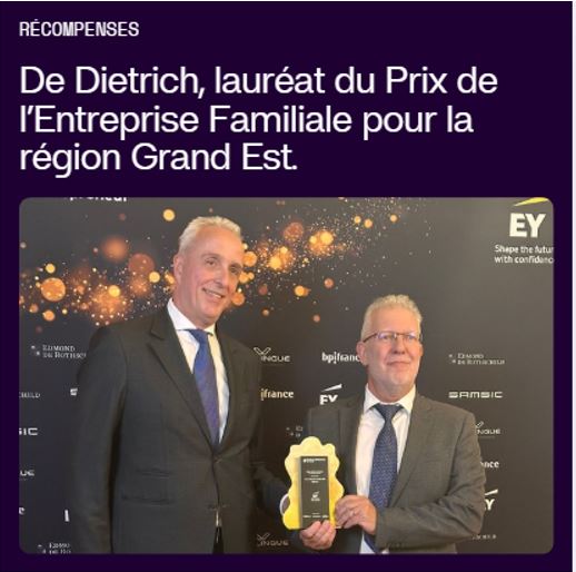 Lors de la 33ᵉ édition du Prix de l’Entrepreneur de l’Année, organisée par Ernst & Young, De Dietrich a reçu le Prix de l’Entreprise Familiale pour la région Grand Est, une distinction qui récompense une entreprise visionnaire.